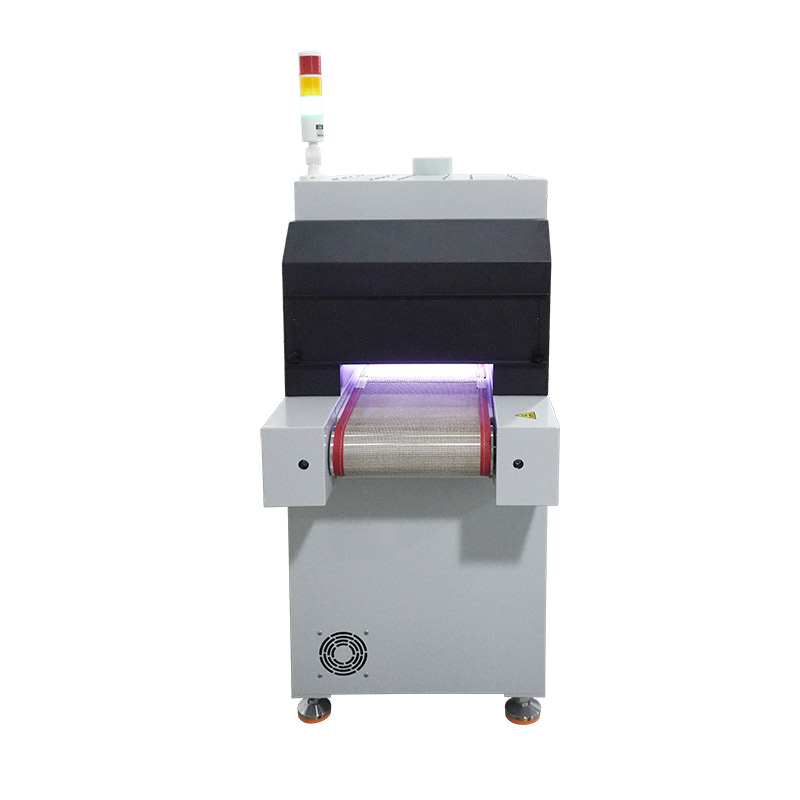 2、设备提供连续模式和后端模式、步进模式可选,连续模式下,点击启动按钮,UV机传送带及 UVLED一直工作,点击停止按钮停止UV机工作;后端模式下,点击启动按钮,UV机传送带及UVLED开始工作,当后端传感器感应到产品后,传送带及UVLED停止工作,当产品拿走后继续进入下一个循环;步进模式下,点击启动按钮,UV机传送带开始工作,当步进传感器感应到产品,传送带停止运行,UVLED以步进参数工作,步进参数运行完成后,UVLED关闭,传送带开始工作,当后端传感器感应到产品时,传送带停止工作,当产品拿走后继续进入下一个循环。