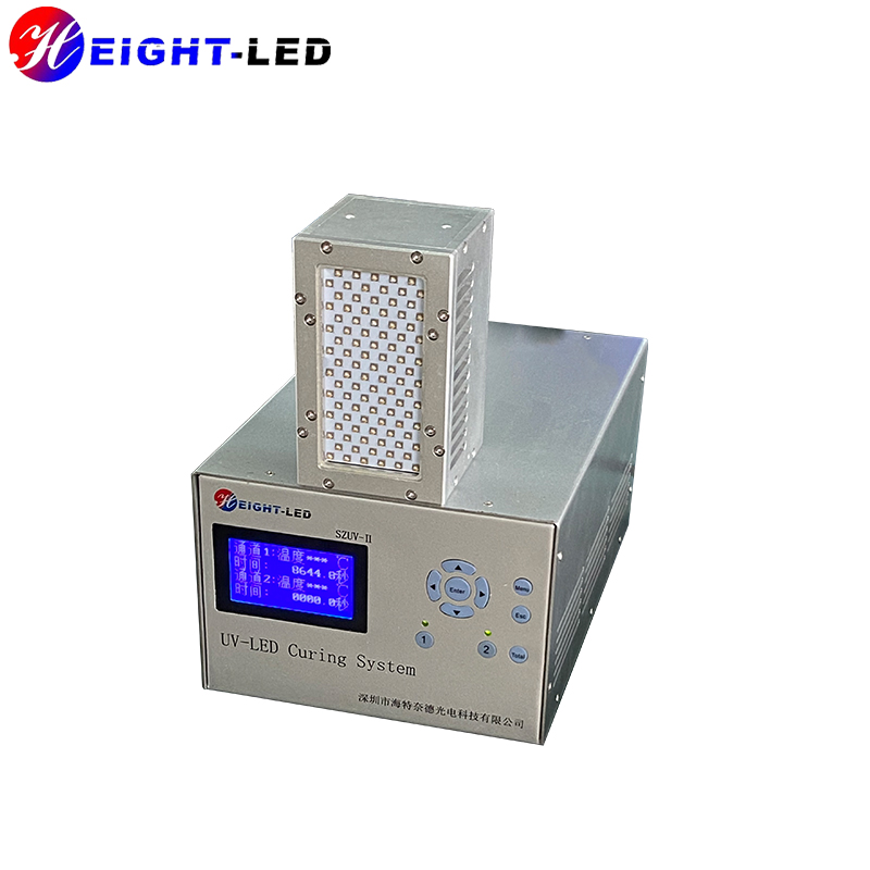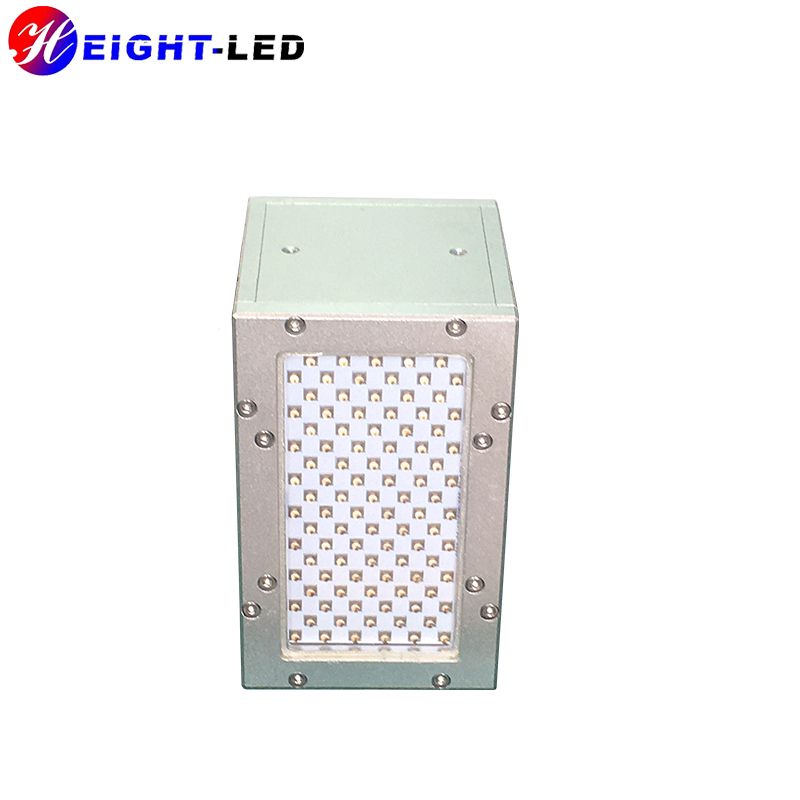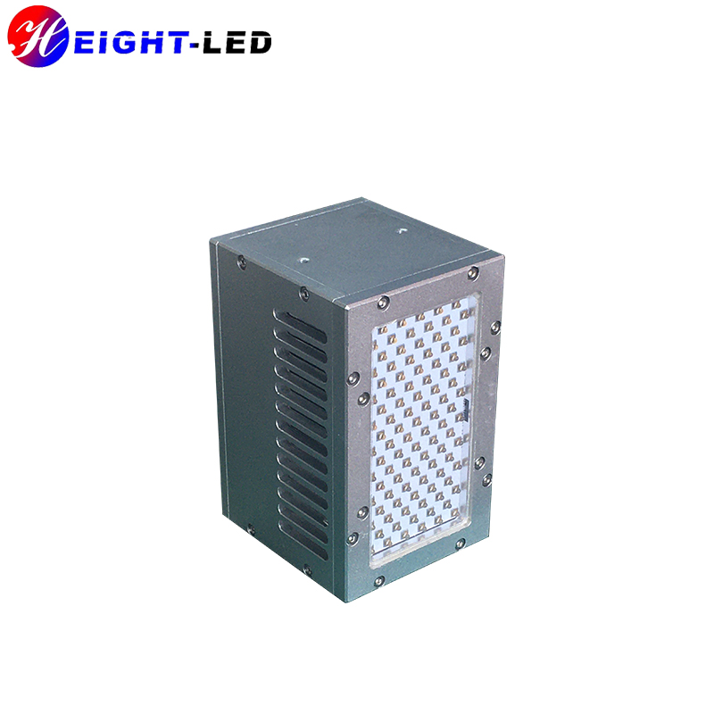 This is a high-performance uv led light source curing system. The system mainly includes a controller and an irradiation head. The irradiation head uv lamp is assembled from imported LED lamp beads. The uv lamp has stable performance and reliable quality. The uv spectrum of this light source is 365nm, the effective irradiation area is 100x50mm, it adopts forced air cooling to dissipate heat, supports external signal input and triggering, and can be equipped with semi-automatic or fully automatic production lines.