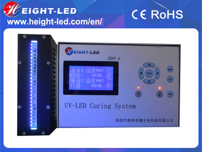 SZUV-II-FS14010-NH is a high-performance UVLED  curing system, the system includes the controller, UVLED irradiation head and cable. UVLED head with imported high-intensity UV LED integrated UV spectral wavelength of 365nm, 385nm, 395nm, 405nm,the use of forced air cooling,the effective curing area of 140x10mm,support for external signal input and trigger, can be equipped with semi-automatic or fully automated production line .