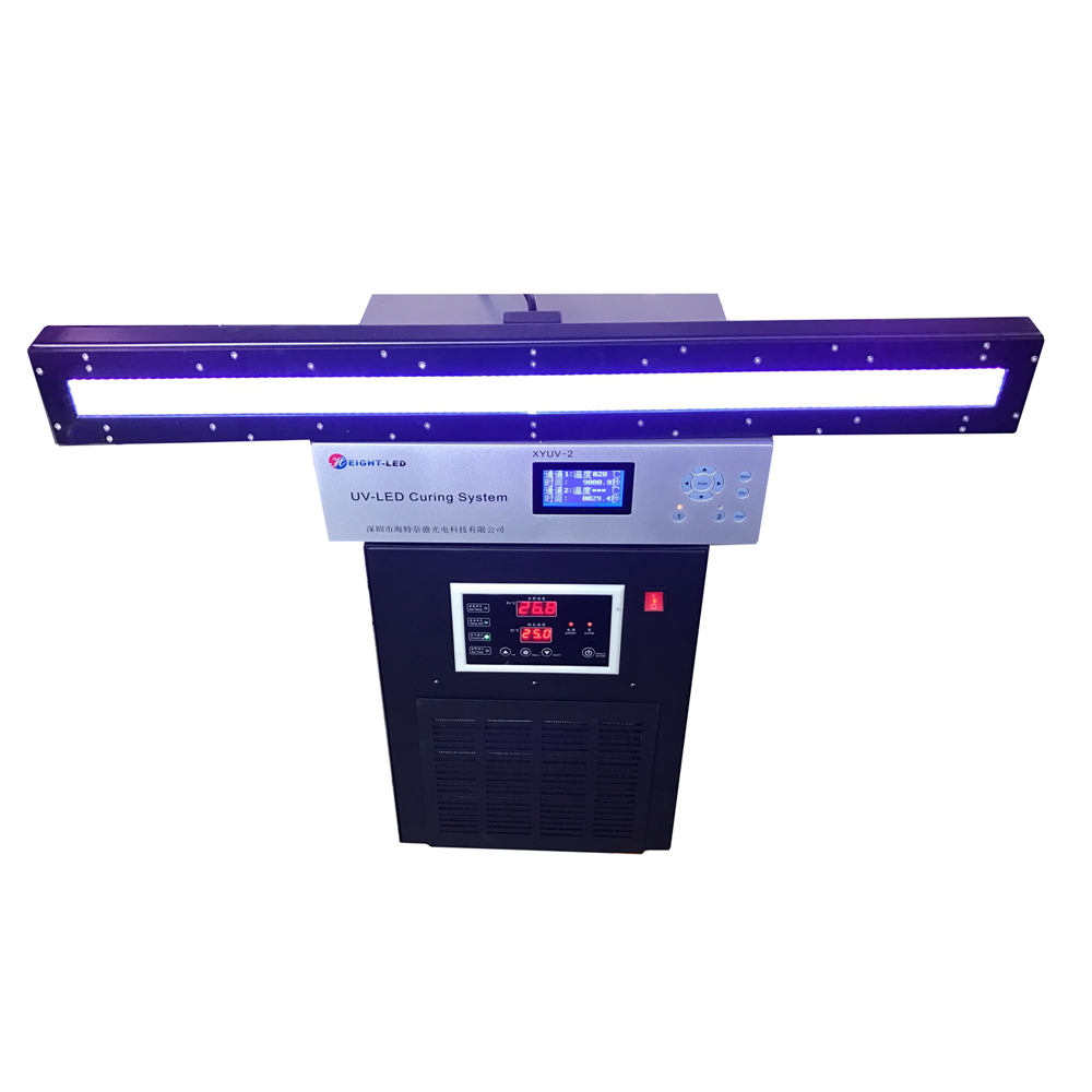 This is a high-performance UVLED curing system, the system includes the controller, UVLED irradiation head and cable. UVLED head with imported high-intensity UV LED integrated UV spectral wavelength of 365nm, 385nm, 395nm, 405nm, the use of forced air cooling, the effective curing area of 750X30mm, support for external signal input and trigger, can be equipped with semi-automatic or fully automated production line .