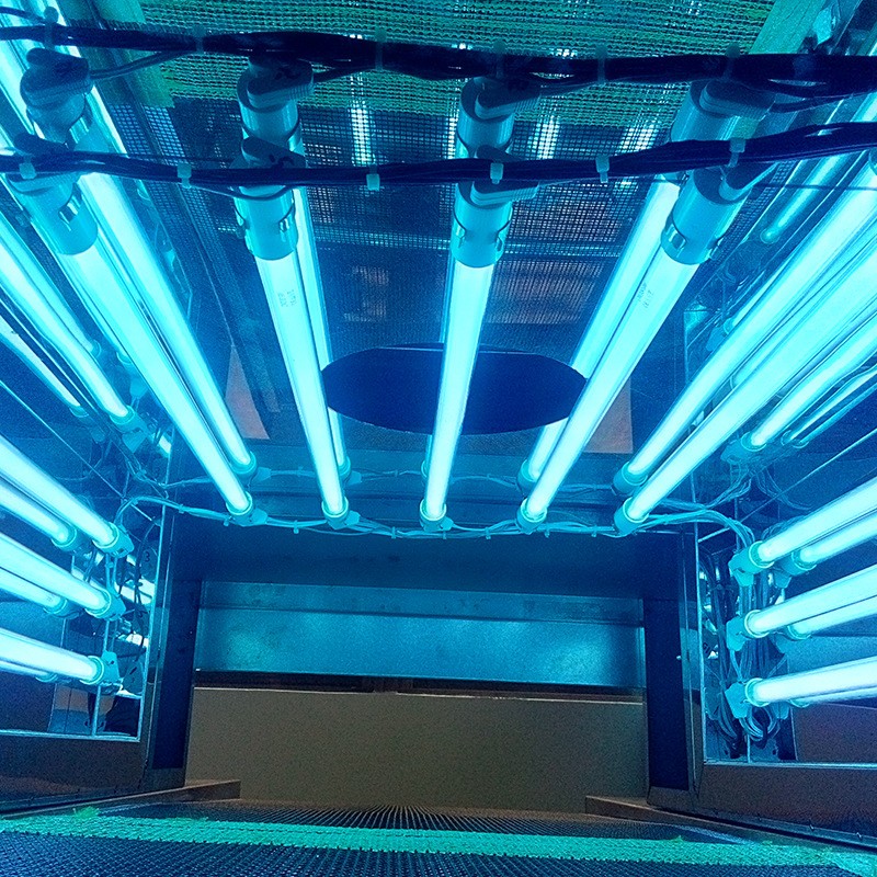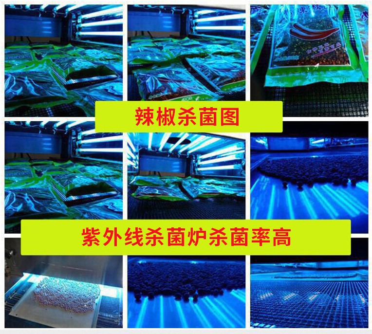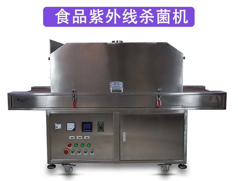 5、各组杀菌灯可单独控制, 增加可调整 UV 灯管角度的调节装置, 灯管总长589mm, 波长为 254.7mm, 杀菌率可以达到 95%)。装有自动计时器, 可随时监控灯管的使用时间, 方便灯管的更换。如产品为可掉渣类, 可采用托盘放在输送带上杀菌。